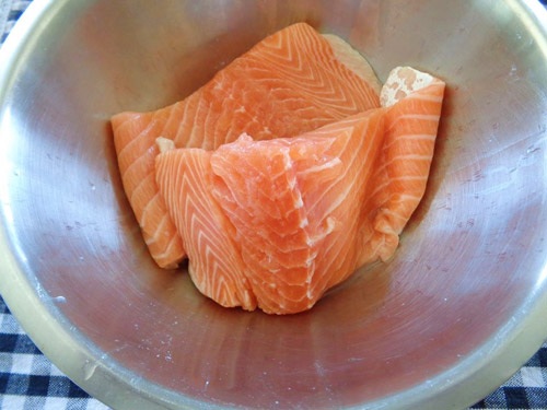 Bước 1: Cá hồi rửa với nước có pha muối. Sau đó ngâm cá vào sữa tươi 40 phút.