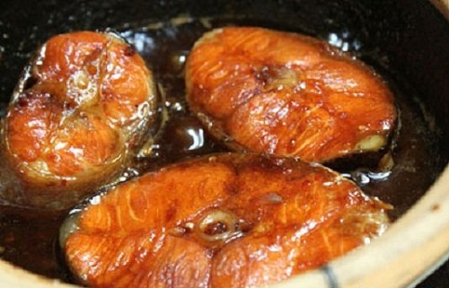 – Rưới đều hỗn hợp gia vị đã chuẩn bị sẵn lên đều khắp các lát cá, cứ để lửa nhỏ như thế rim từ từ, thỉnh thoảng lật mặt cá cho cá ngấm gia vị đến khi hỗn hợp gia vị cô lại thành một màu vàng cánh gián đậm bao quanh lát cá là được;