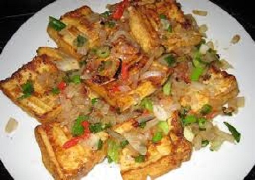 - Đầu tiên cắt đậu hũ ra thành những khối vuông cỡ 2x2 cm