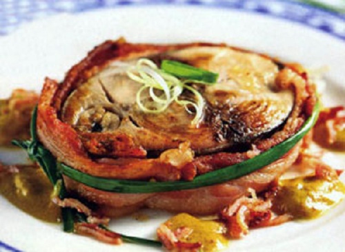 - Lấy từng lát thịt ba chỉ xông khói còn lại quấn quanh khúc cá, dùng tăm giữ chặt miếng thịt vào miếng cá, sau đó buộc bằng cọng hành lá.