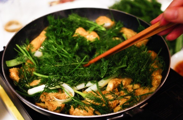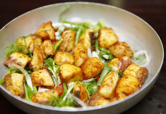 – Cho mỡ cá vào chảo, rán cho tan hết.Đổ cá đã nướng vào chảo mỡ. Nhanh tay cho rau và hành vào đảo đều nhẹ nhàng là có thể ăn được rồi.