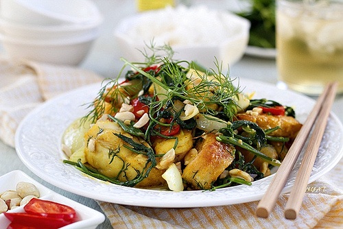 Bước 4: Để lửa lớn, làm nóng 1 thìa canh dầu ăn trong chảo, thêm cá vào đảo nhanh tay. Đến khi cá chín thì cho hành và thì là vào đảo đều là được. Múc cá xào ra đĩa, rắc ít cọng hành lên trang trí cho đẹp.