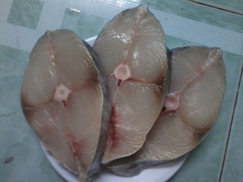 - Cá thu bạn mua về rửa sạch, cắt thành từng miếng có độ dày khoảng 5cm.