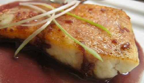 Cho cá lên đĩa, chan sốt rượu nho đỏ lên. Trang trí tùy thích.