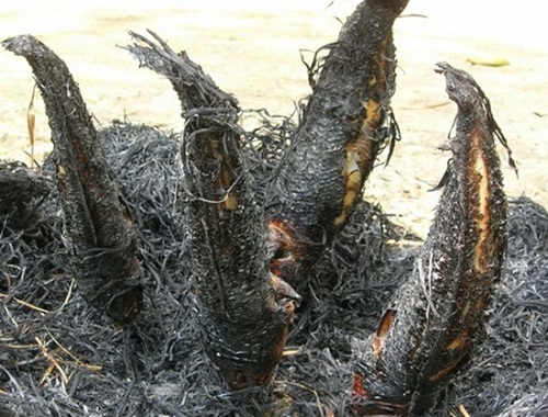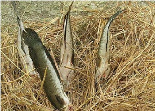 – Dùng thanh tre xuyên từ miệng tới đuôi cá rồi cắm xuống đất rồi chất rơm xung quanh.