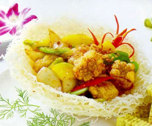 - Dùng lại chảo, trút bớt dầu rồi cho bơ, tỏi, hành tây vào xào cho thơm, tiếp tục cho ớt Đà Lạt vào đảo đều. Sau đó cho cá mú vừa chiên sơ vào, đảo đều, nêm lại với xốt O.K, hạt nêm, nước tương, đường vừa ăn.