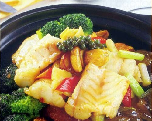 - Dùng lại chảo, cho tỏi đã chiên, gừng thái miếng vào xào thơm, tiếp tục cho heo quay, nấm đông cô, bông cải xanh, bắp non, đậu hào vào đảo đều cùng với nước dùng, đun 2 phút sau đó cho cá mú, tiêu xanh vào hầm vừa chín tới, thêm ít bột năng để nước hơi sánh.