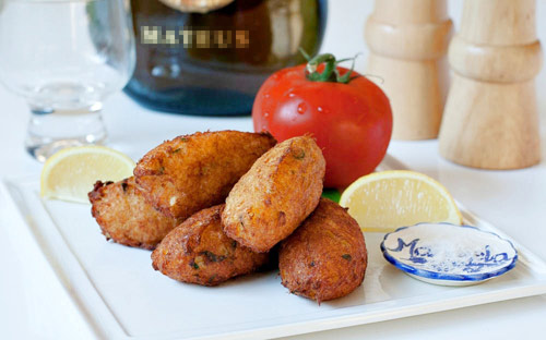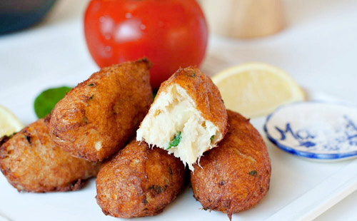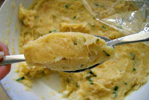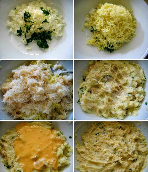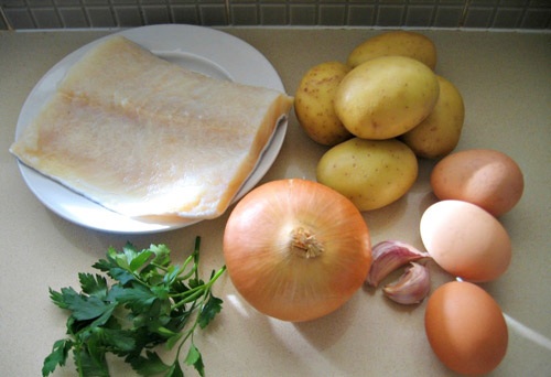 Luộc khoai tây trong nước muối. Khi khoai tây chín, để ráo nước rồi nghiền nhuyễn chúng. Cho hành, tỏi và rau mùi tây vào bát. Cho cá tuyết đã chà xát và khoai tây vào. Thêm muối và hạt tiêu, trứng đánh nhuyễn rồi trộn đều.