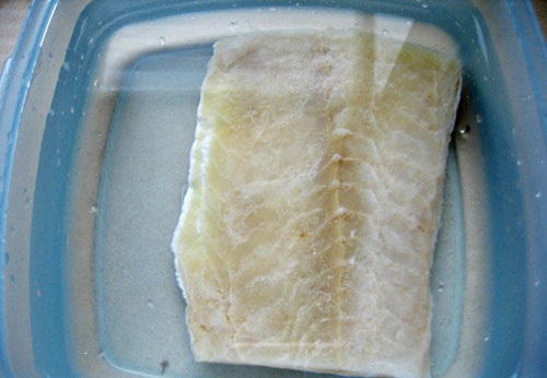Ngâm cá tuyết ướp muối trong nước khoảng 24 giờ. Bạn chú ý phải thay nước thường xuyên để loại bỏ bớt muối trong cá nhé.