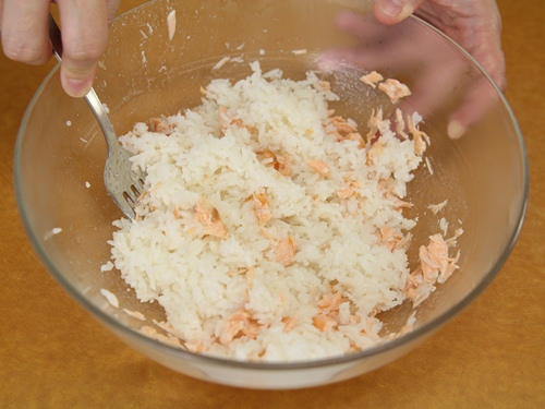 Bước 2: Cho cá hồi vào trong bát, dùng dĩa dầm vụn cá rồi cho vào bát cơm, trộn đều.
