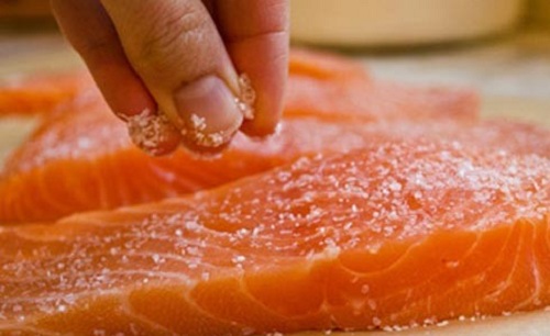 - Đầu tiên bạn sơ chế cá hồi rồi rửa sạch, tiếp đó thì bạn thấm khô, ướp cá với một chút hạt tiêu và muối rồi để 30 – 45 phút cho cá ngấm đều gia vị.