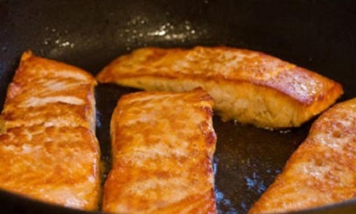 - Sau khi cá đã ngấm đều gia vị rồi bạn cho cá hồi vào chiên trong chảo dầu nóng, cần chú ý trong thời gian chiên để các mặt của miếng cá đều chín vàng, không bị cháy.